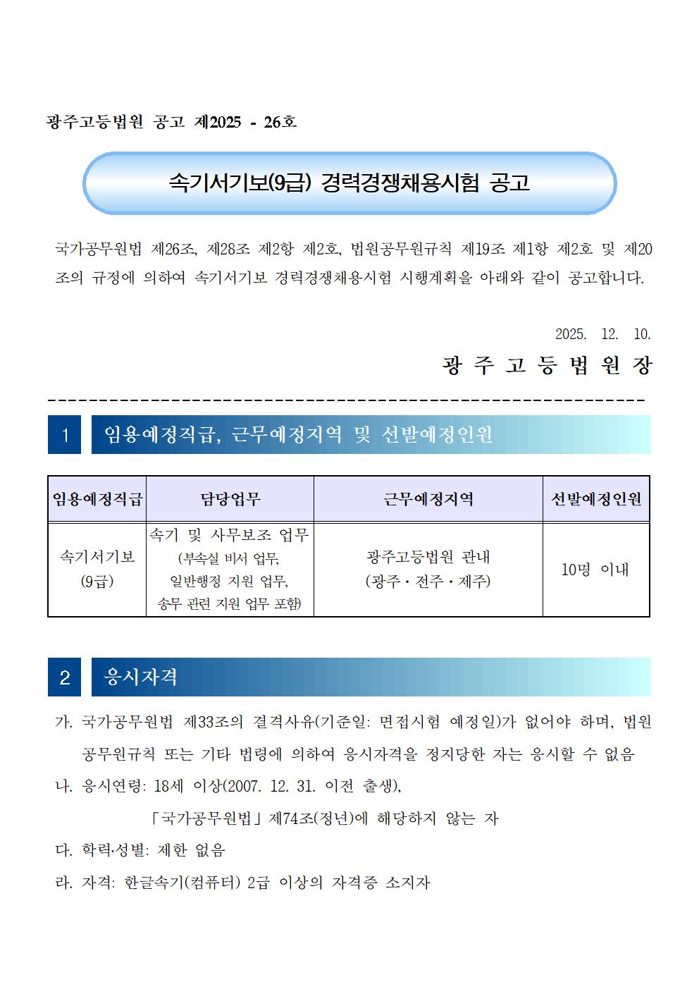 광주고등법원 속기서기보(9급) 채용공고