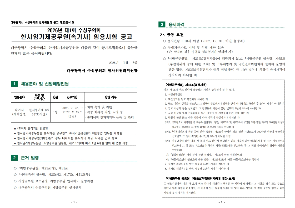 대구수성구의회 속기사 채용공고
