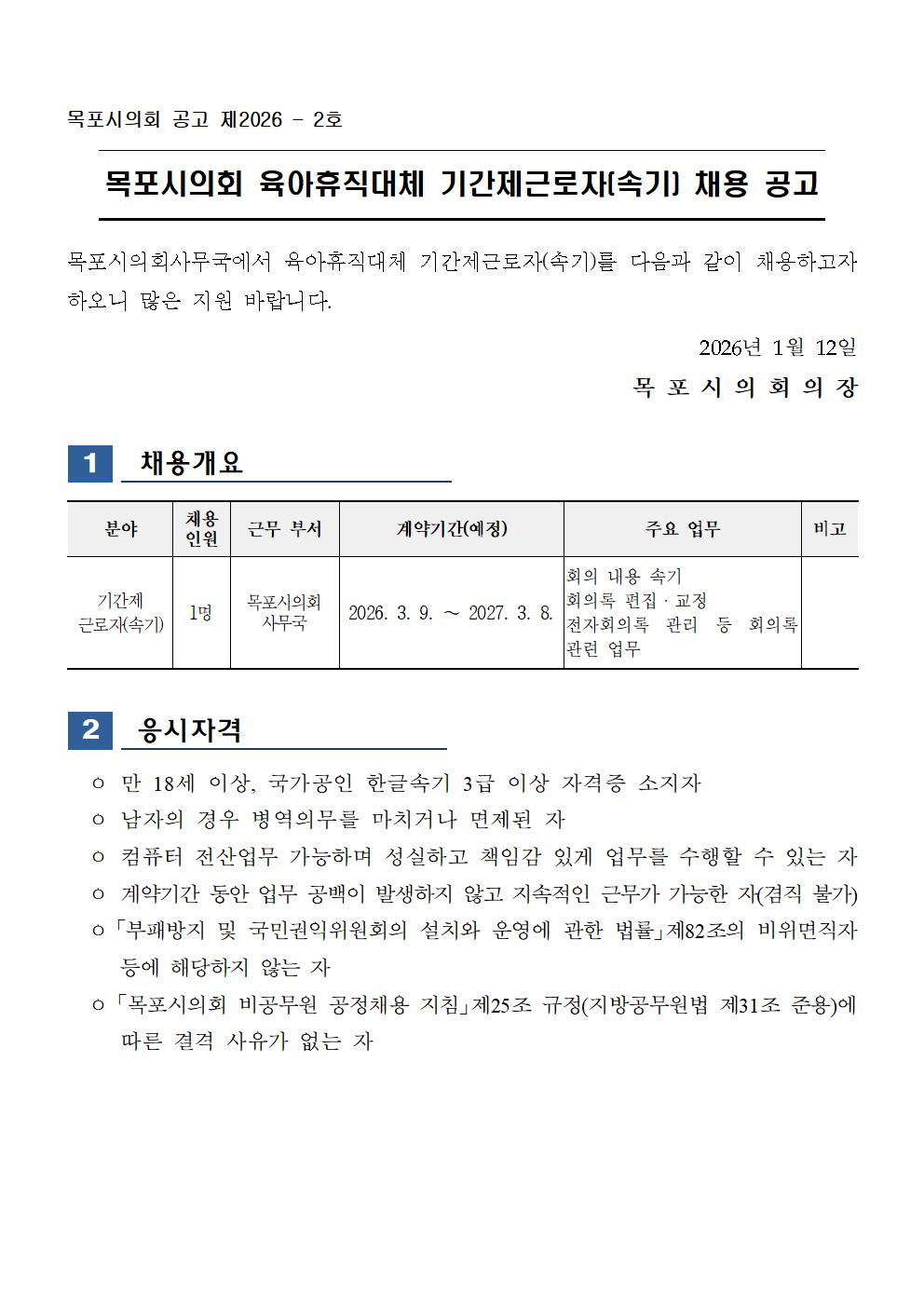 목포시의회 속기사 채용공고