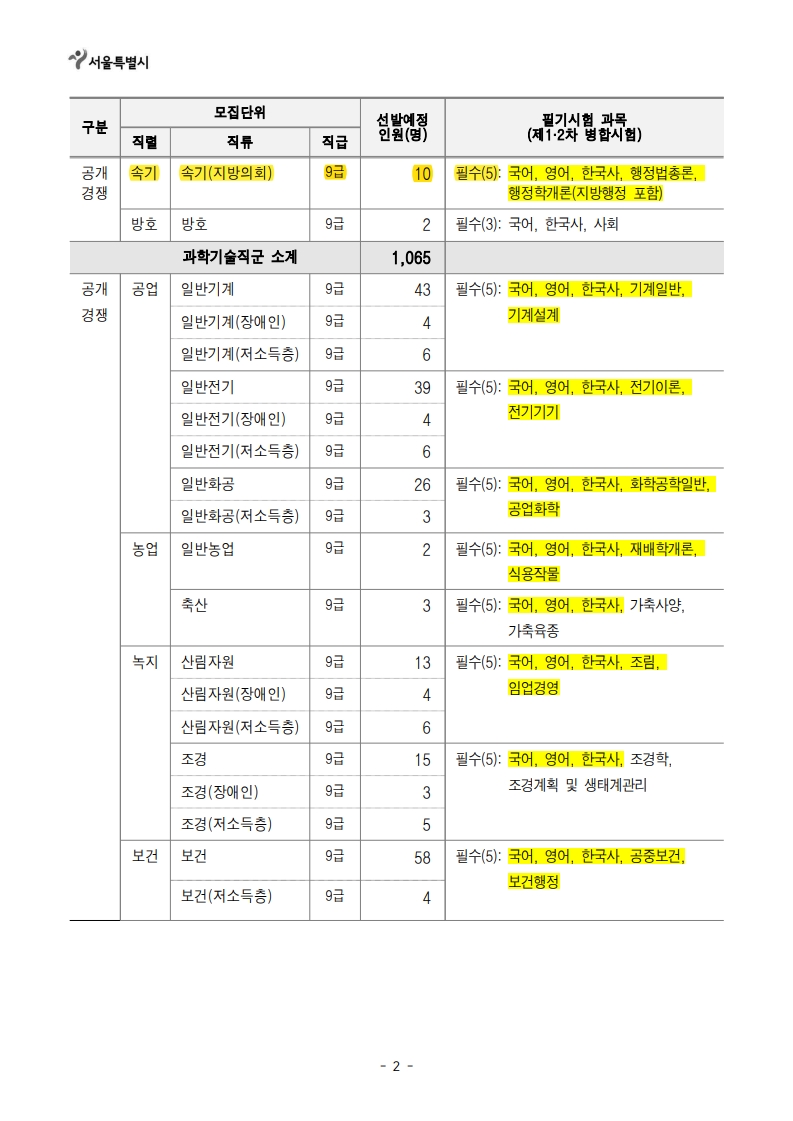 서울특별시 속기직공무원(9급) 10명 채용공고
