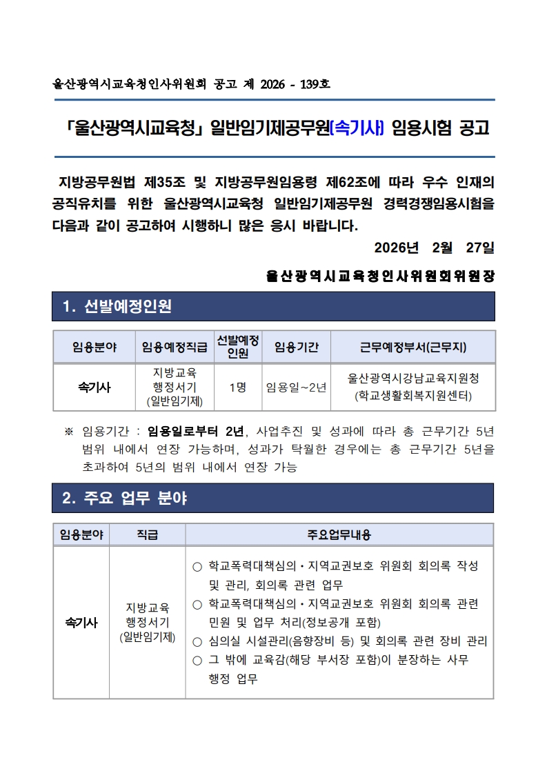 울사광역시교육청 속기사 채용공고