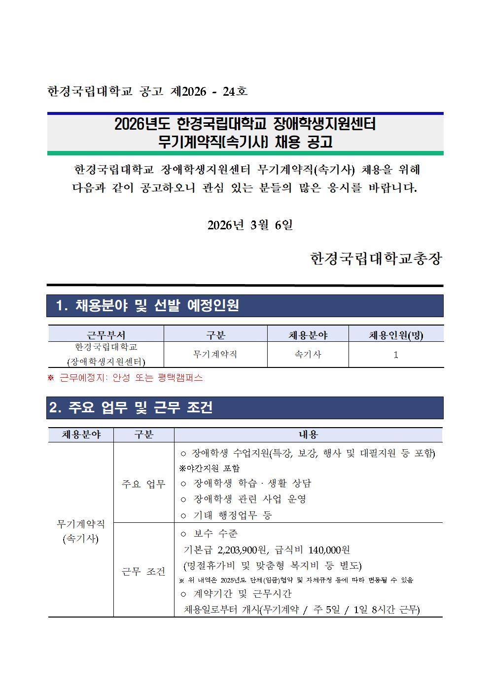 한경국립대학교 교육속기사 채용공고